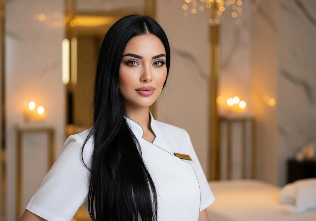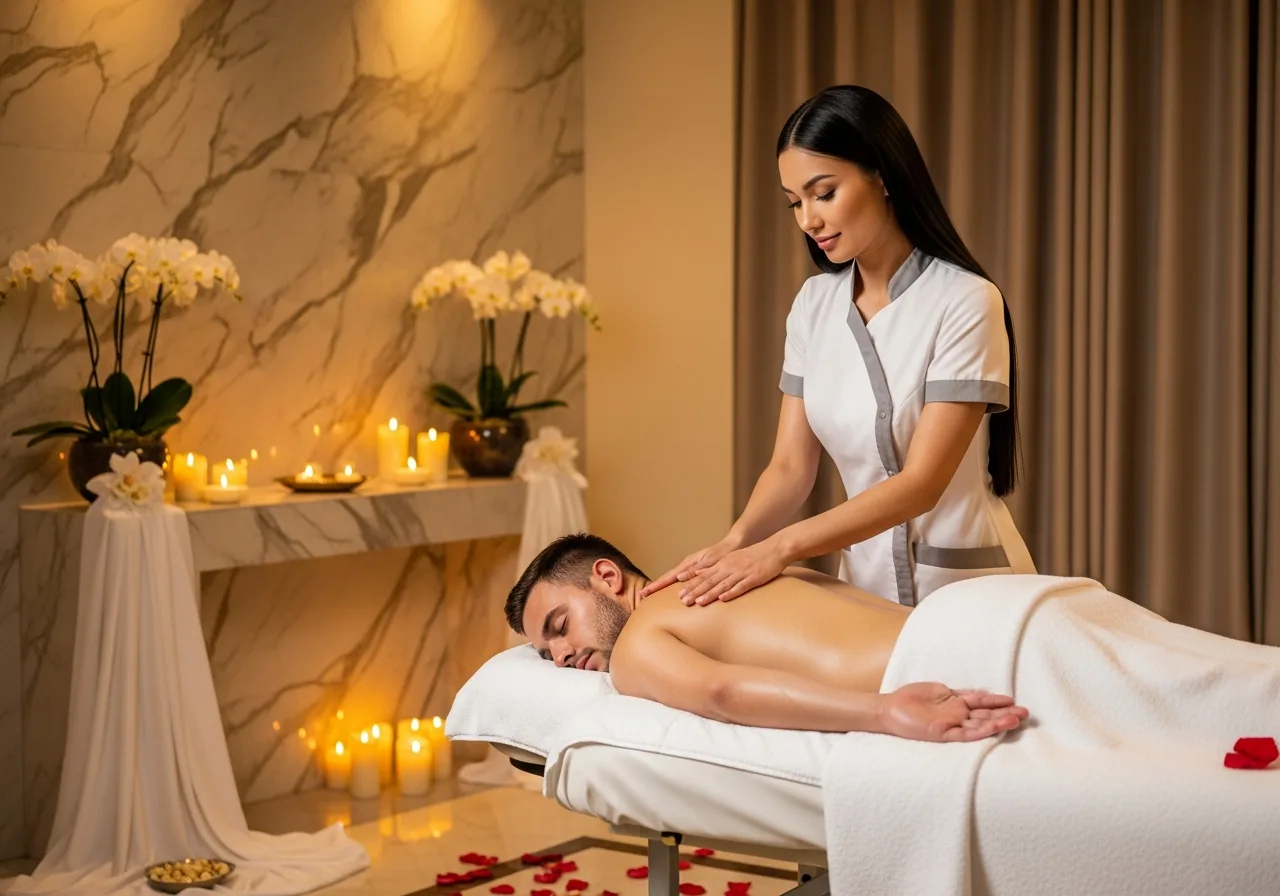 Professional female massage therapist giving relaxing massage to client at Lavuna Spa Dubai